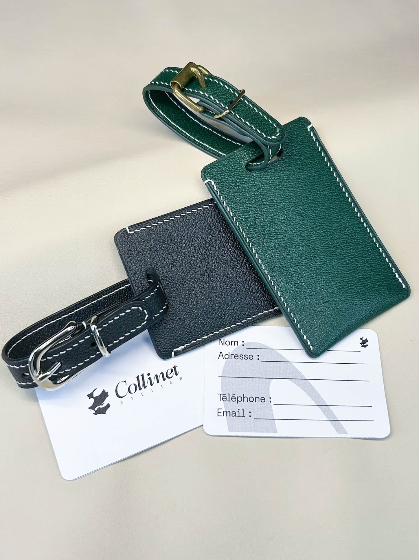 Fabriqué à la main dans un cuir de chèvre grainé sélectionné pour sa souplesse et sa robustesse, il est conçu pour résister aux aléas des trajets répétés. Son format compact (10,7cm de long, 6,8 cm de large, environ 2,7 mm d’épaisseur) se fixe facilement sur une valise ou un sac de voyage.