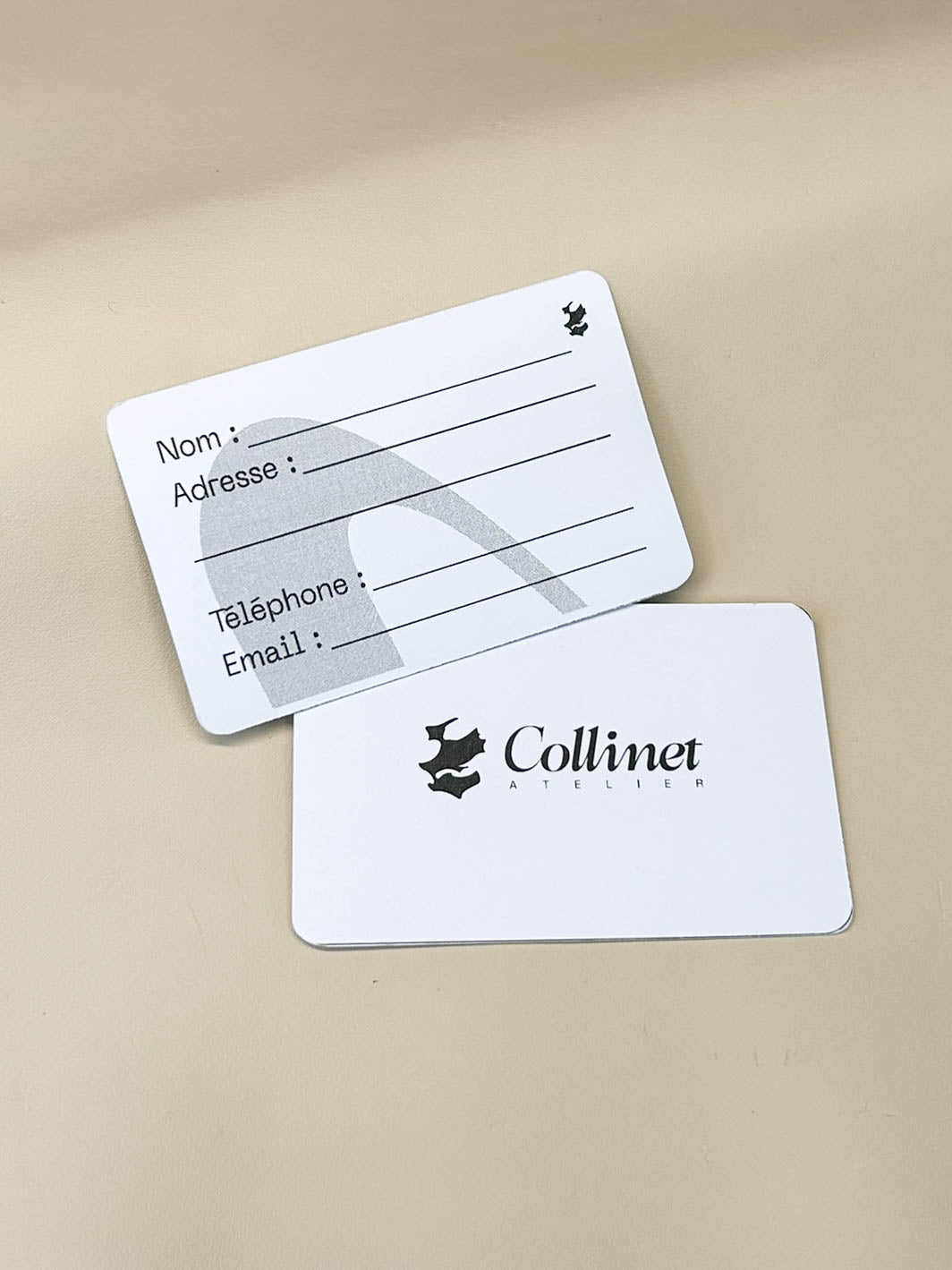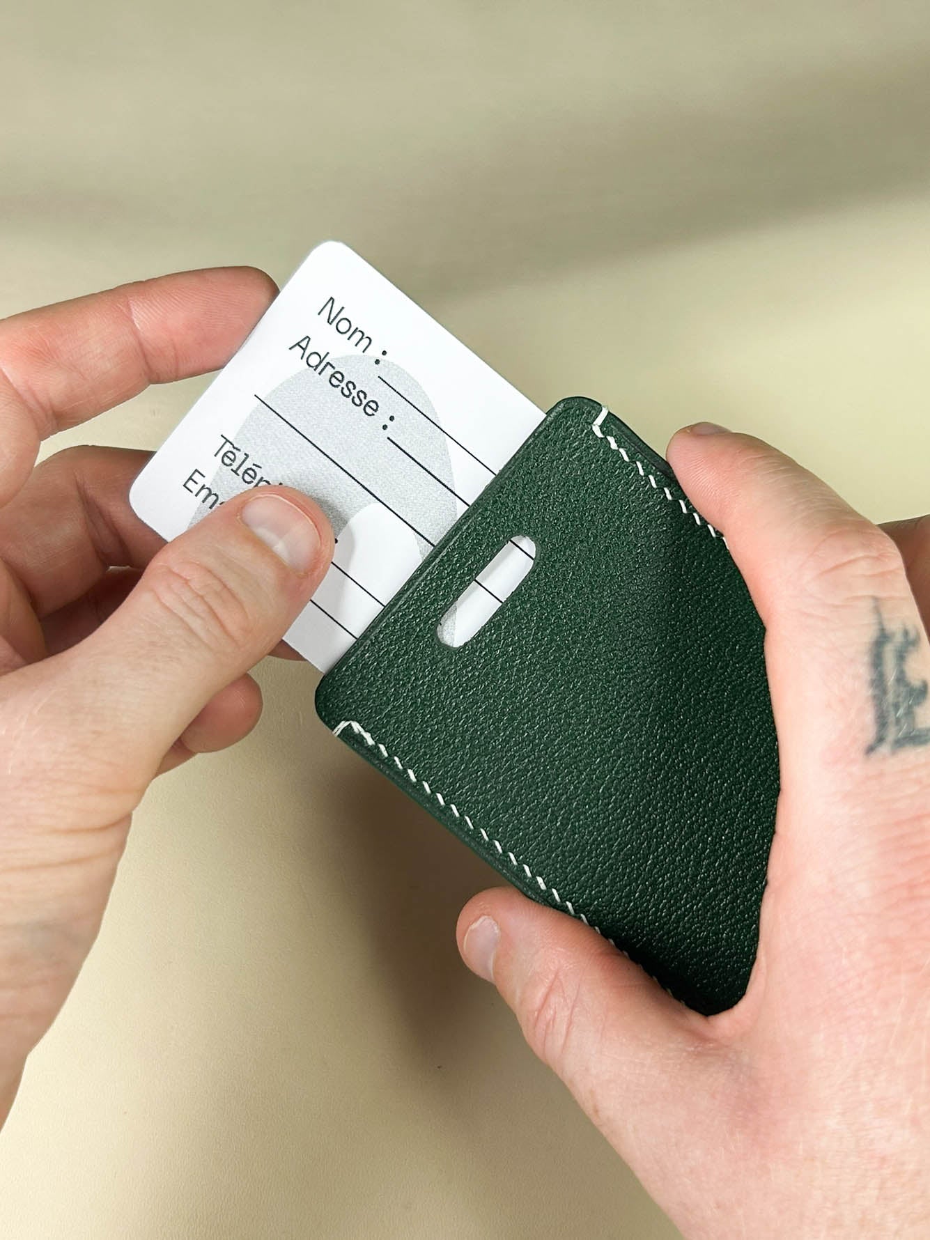 La carte glissée à l’intérieur n’est pas visible de l’extérieur, à l’exception d’une petite ouverture discrète en haut qui permet de sortir la carte pour voir les coordonnées en cas de besoin.